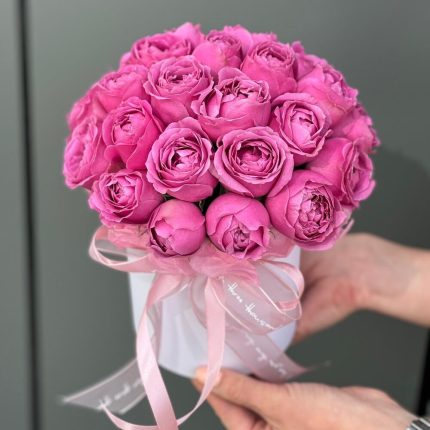 Бархатный цилиндр из тюльпанов, озотамнуса и пионовидной розы