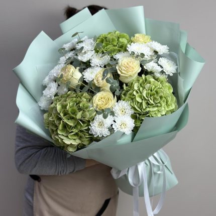 Букет из лилий, гортензии, эустомы, роз, гвоздики и гипсофилы в корзине “Карндона”