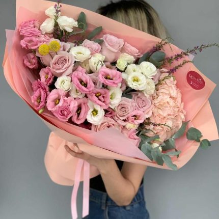 Букет из гортензии, хризантемы, гвоздики, оксипеталума и роз в стильной упаковке “Ласковый ветерок”