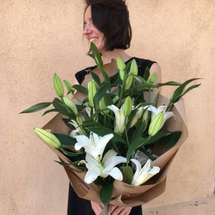 Авторский букет “Душистый горошек” с белой лилией, хлопком и лизиантусом