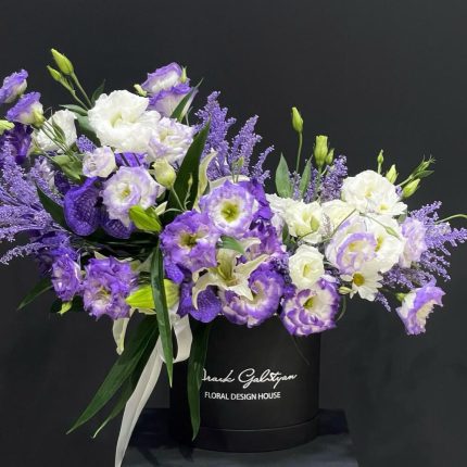 Букет из гортензии, роз, лилии, гербер, лимониума, сантини и эустомы в стильной упаковке Туманное поле