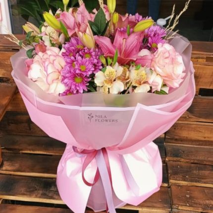 Букет из пионов, трахелиума, кустовых роз, гвоздики, эустомы, твидии, кустовой хризантемы и лилии в стильной упаковке “Офра”