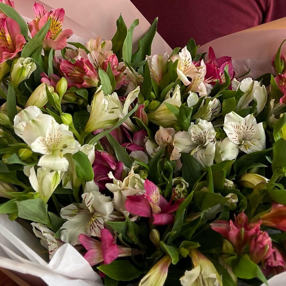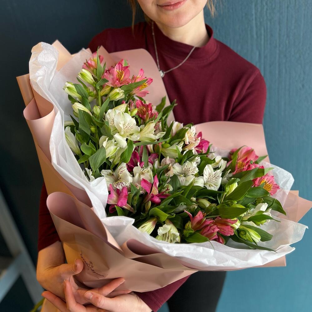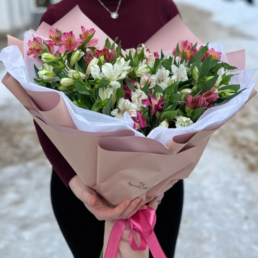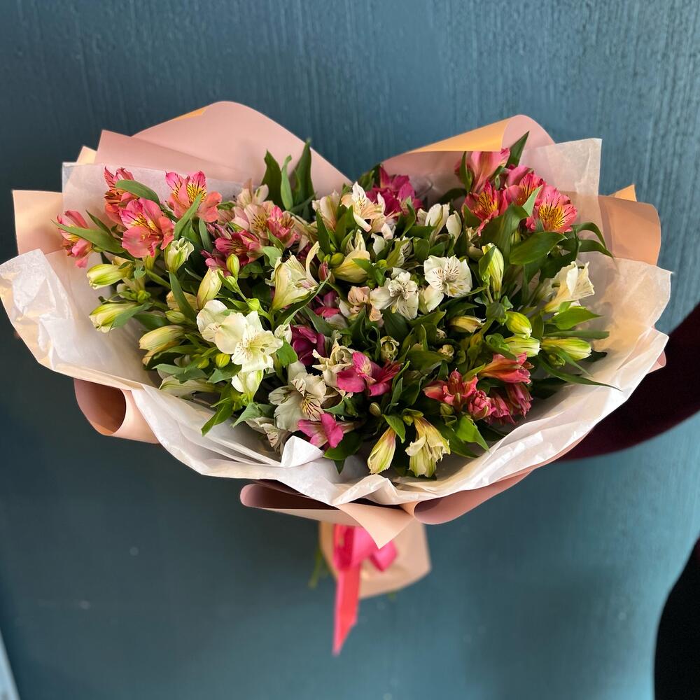 Альстромерия – 25 шт.Лента атласная – 1 шт.Тишью – 3 шт.Пленка матовая – 1 шт.