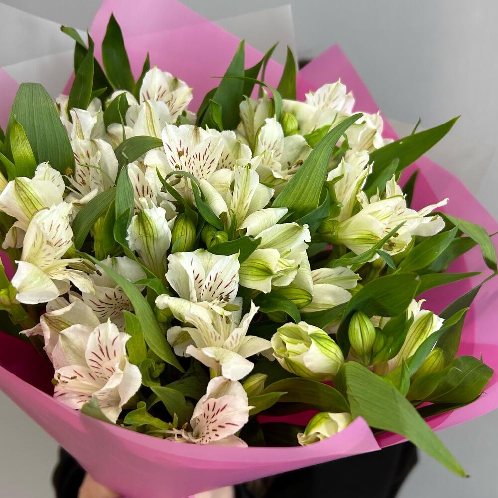 Лента атласная – 2 шт.Альстромерия – 11 шт.Упаковка дизайнерская – 2 шт.Зелень – 2 шт.