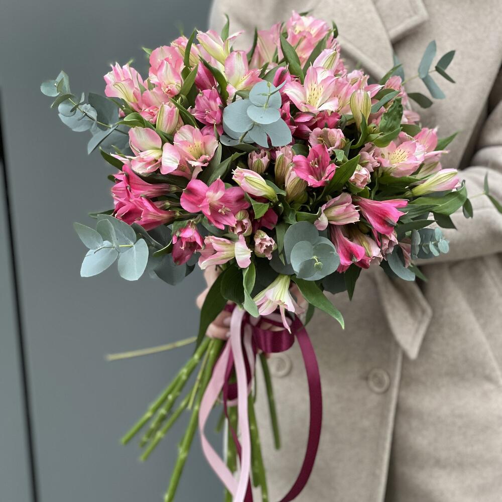 Альстромерия – 15 шт. Эвкалипт – 2 шт. оформление – ленты – 1 шт.
