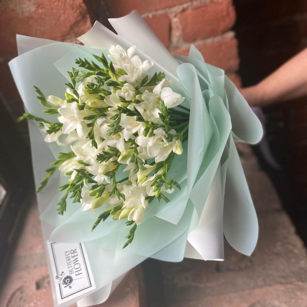 Букет из 23 белых фрезий в стильной упаковке "Мегги Вэлли"