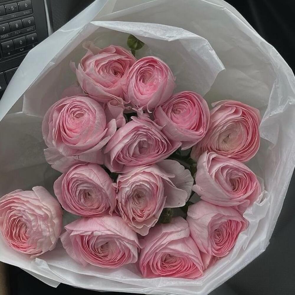 Ранункулюс розовый – 13 шт.Упаковка дизайнерская – 1 шт.Лента атласная – 2 шт.Открыточка с вашими пожеланиями – 1 шт.хорошее настроение – 100 шт.инструкция по уходу за цветами – 1 шт.коробка переноска – 1 шт.Кризал – 1 шт.