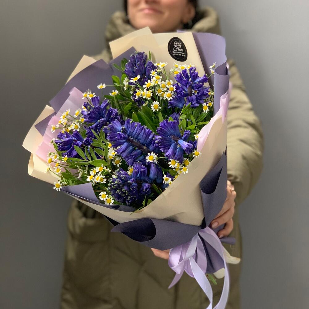Гиацинт синий – 7 шт.Матрикария – 3 шт.Фисташка – 5 шт.Упаковка дизайнерская – 1 шт.Лента атласная – 2 шт.