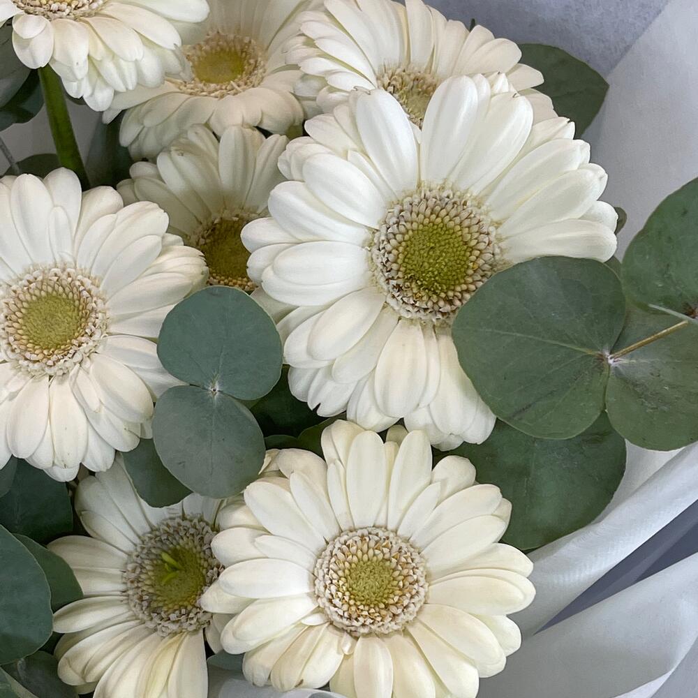Лента – 1 шт.Эвкалипт – 2 шт.Упаковка – 1 шт.Гербера мини – 11 шт.