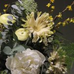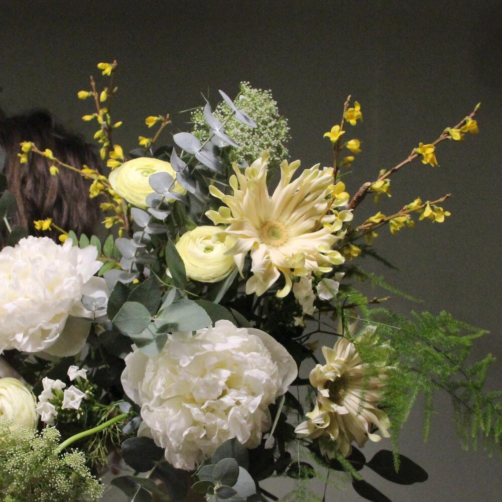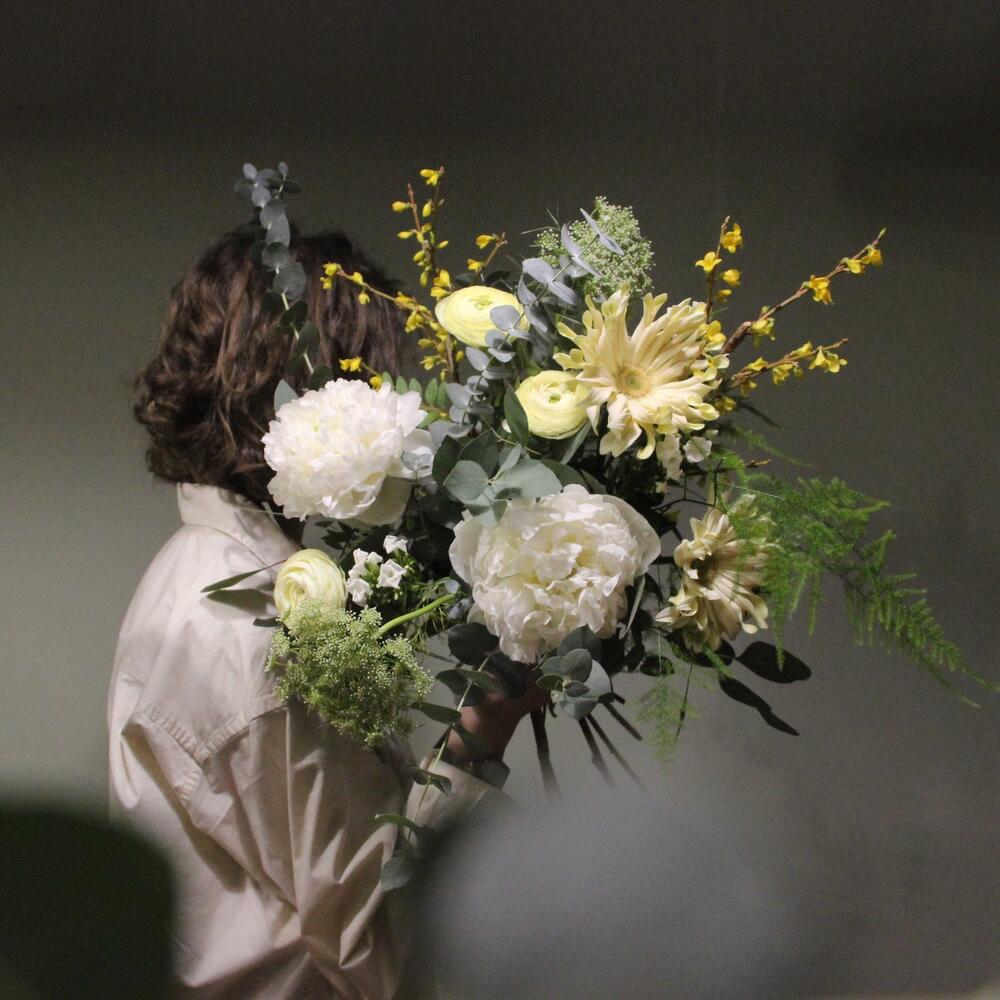 Авторский букет с пионами, ранункулюсами, амми, веточками фрезии и эвкалиптом