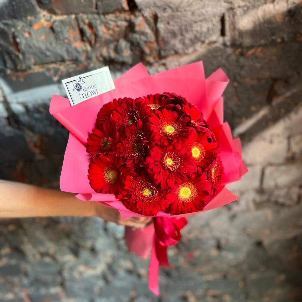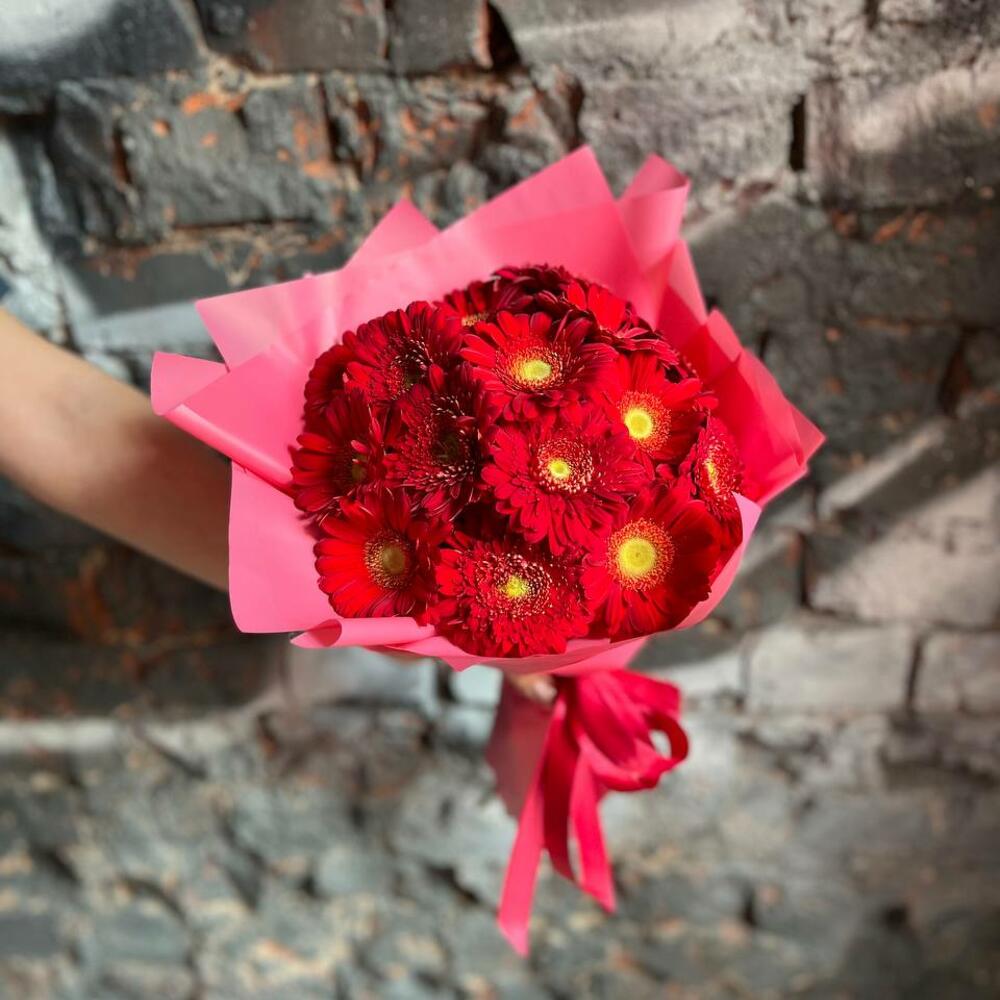 Яркий букет из 15 красных гербер в стильной упаковке “Мадрид”