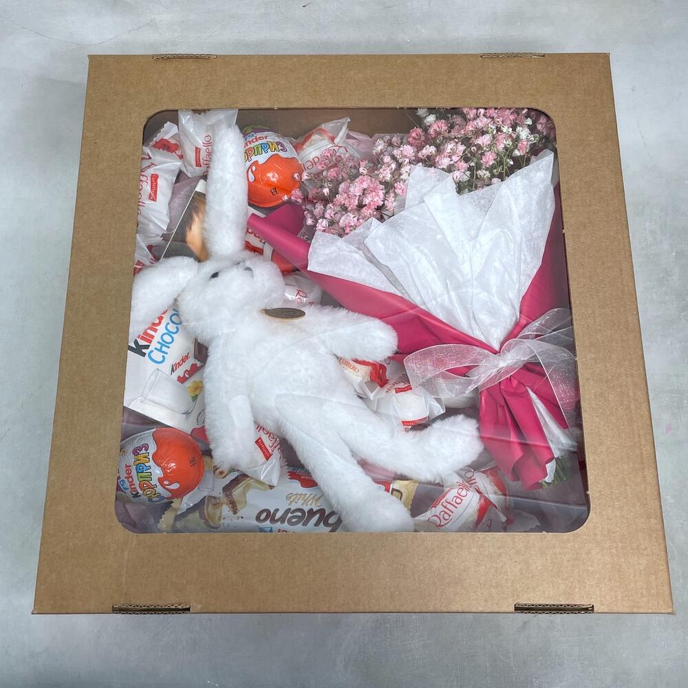 Гипсофила – 3 шт.Упаковка – 1 шт.Kinder bueno – 1 шт.Kinder сюрприз – 2 шт.Kinder chocolate – 1 шт.Raffaello конфеты – 10 шт.коробка крафт с окошком – 1 шт.игрушка зайчонок lapkin – 1 шт.