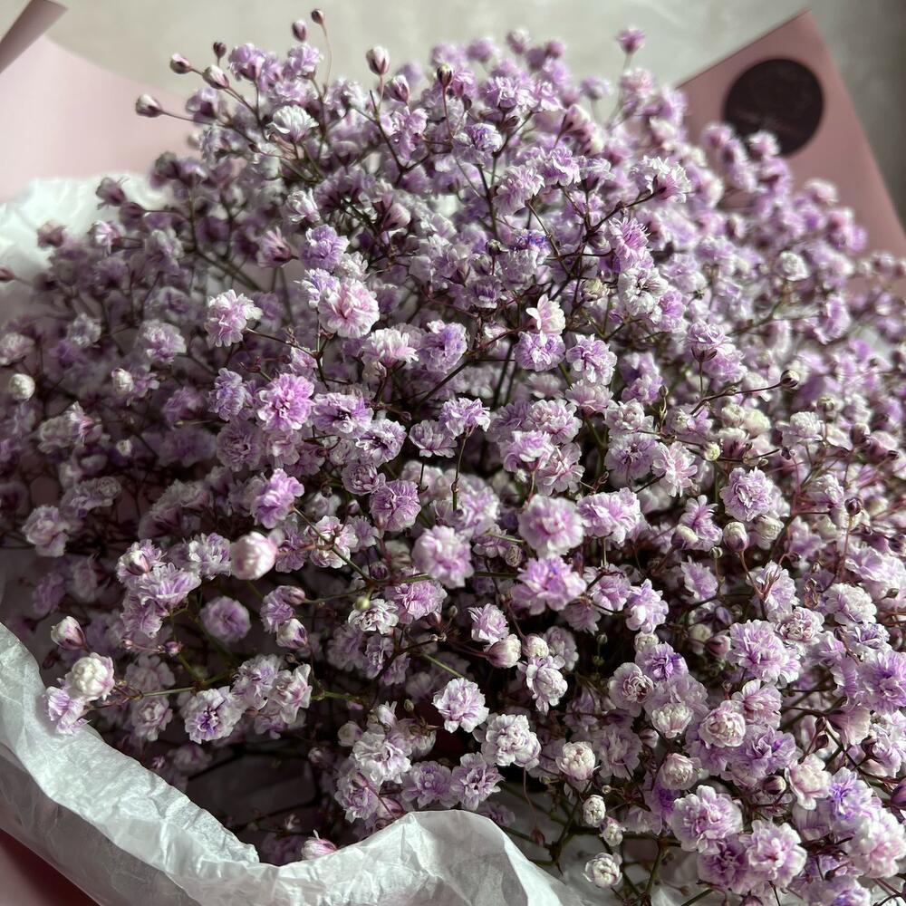 гипсофила лиловая – 7 шт.Дизайнерская упаковка – 1 шт.Атласная лента – 1 шт.