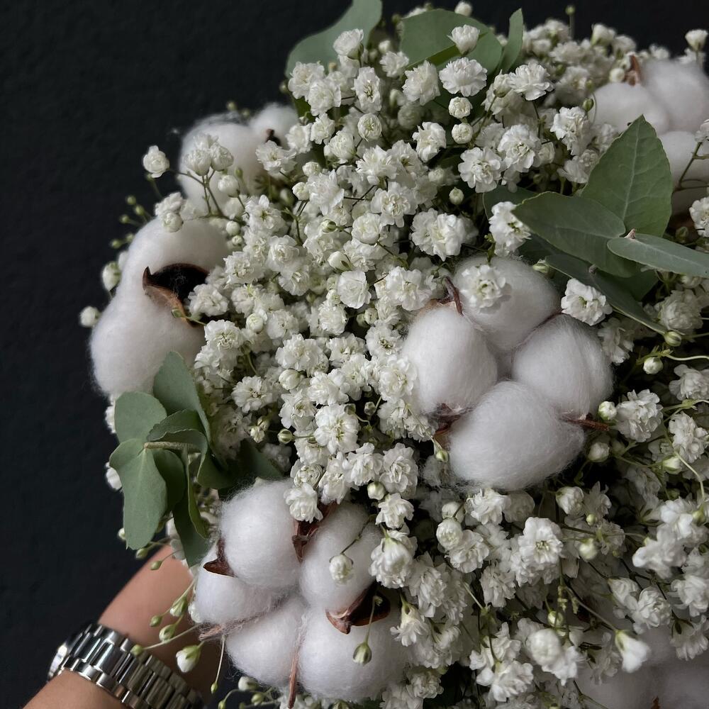 Гипсофила – 9 шт.Хлопок натуральный – 7 шт.Эвкалипт – 5 шт.Атласная лента – 2 шт.