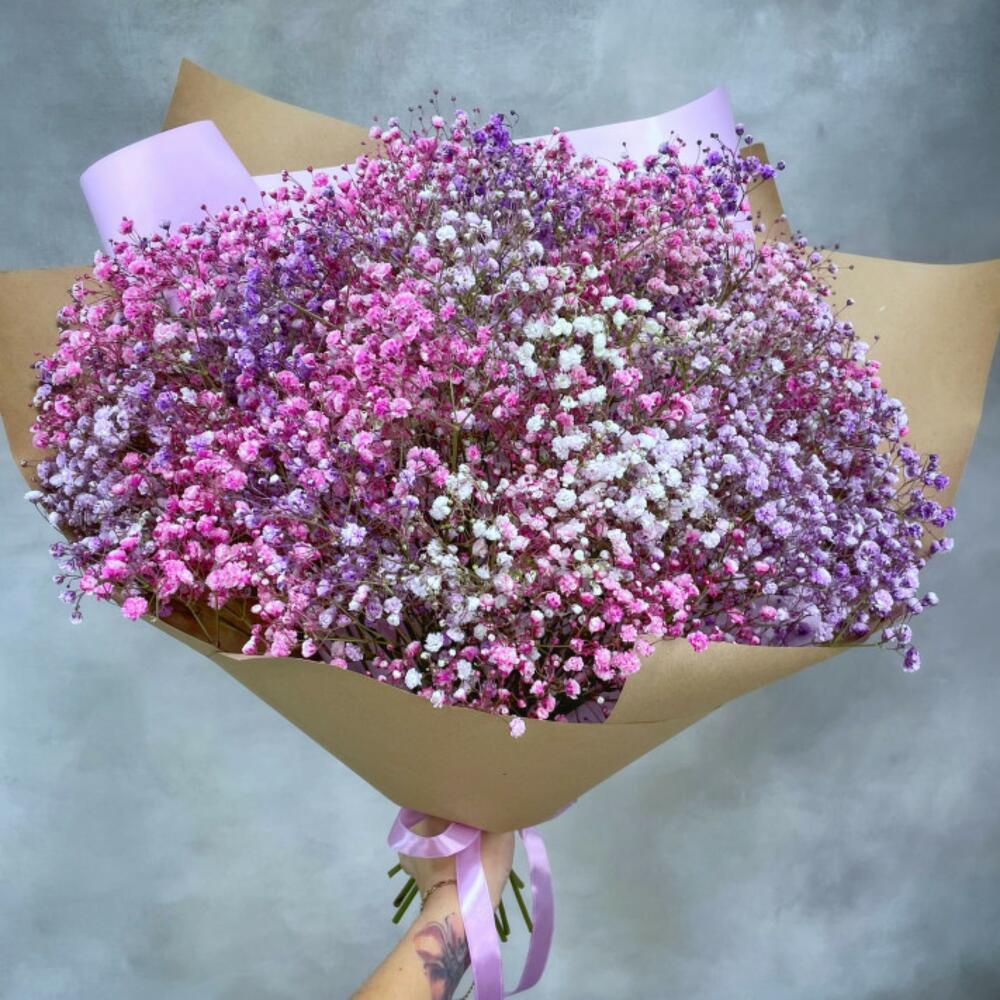 Гипсофила розовая – 8 шт.Гипсофила фиолетовая – 7 шт.Пленка – 2 шт.Лента – 1 шт.