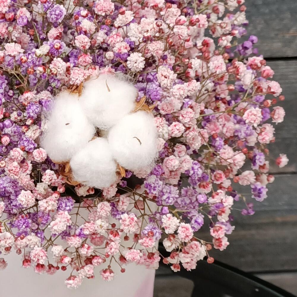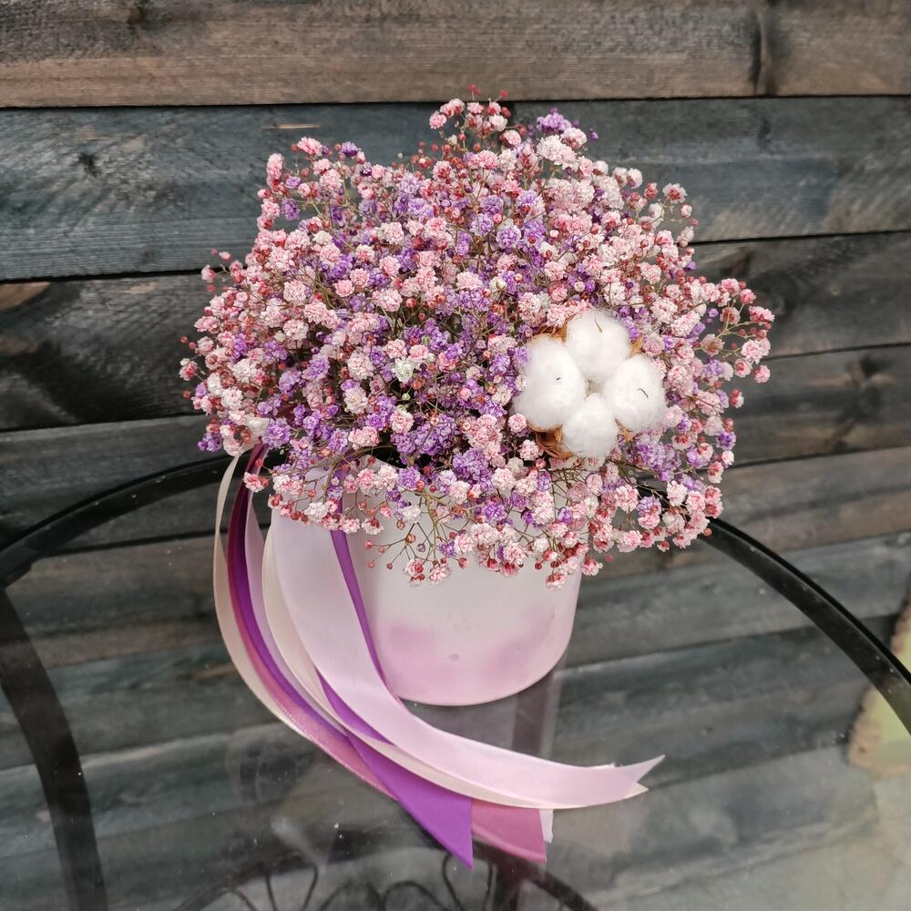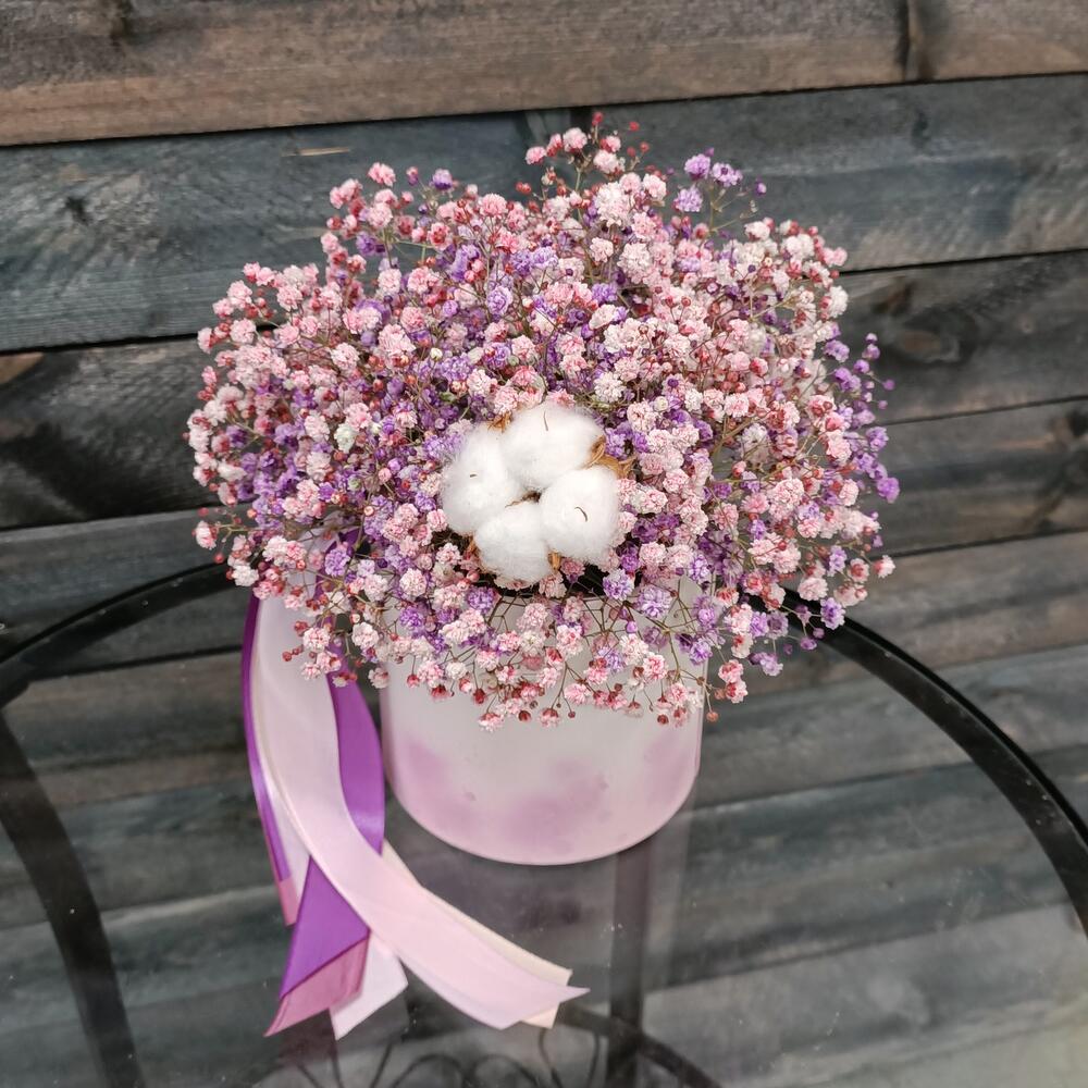 Гипсофила – 4 шт.Хлопок – 1 шт.Лента атласная – 1 шт.Шляпная коробка – 1 шт.Оазис флористический – 1 шт.