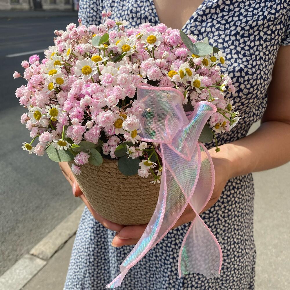 Полевая ромашка и нежно-розовая гипсофила в плетёном кашпо ручной работы не оставят равнодушной ни одну получательницу.В этой композиции удачно сочетаются нежность и выразительность. А особое очарование букету добавляет изящный бант из органзы.Такой подарок не нуждается в вазе, достаточно лишь слегка поливать композицию каждые 2 дня.Приятным дополнением к подарку станет открытка с пожеланиями или сет воздушных шаров в тон цветам.