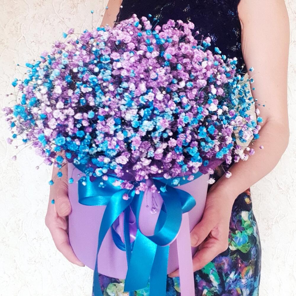 Лента атласная – 2 шт.Открыточка с вашими пожеланиями – 1 шт.Оазис флористический – 1 шт.гипсофила радужная – 15 шт.тишью упаковка сиреневая – 1 шт.