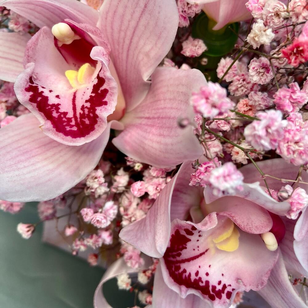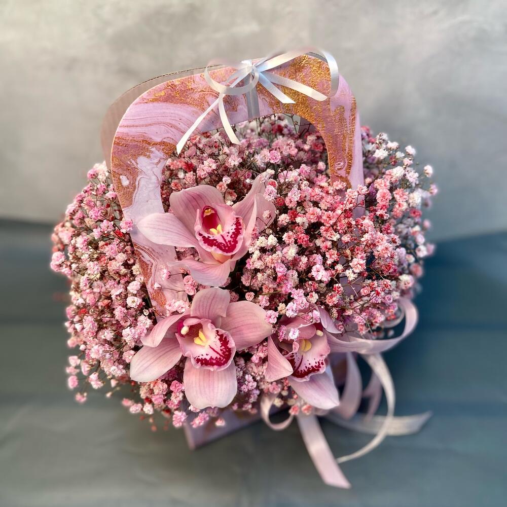 Гипсофила – 6 шт.Орхидея Цимбидиум – 3 шт.Лента атласная – 2 шт.Оазис флористический – 1 шт.Сумка крафт – 1 шт.