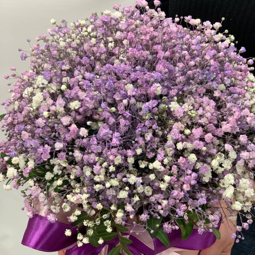 “Сиреневый туман” – композиция из гипсофилы в шляпной коробке