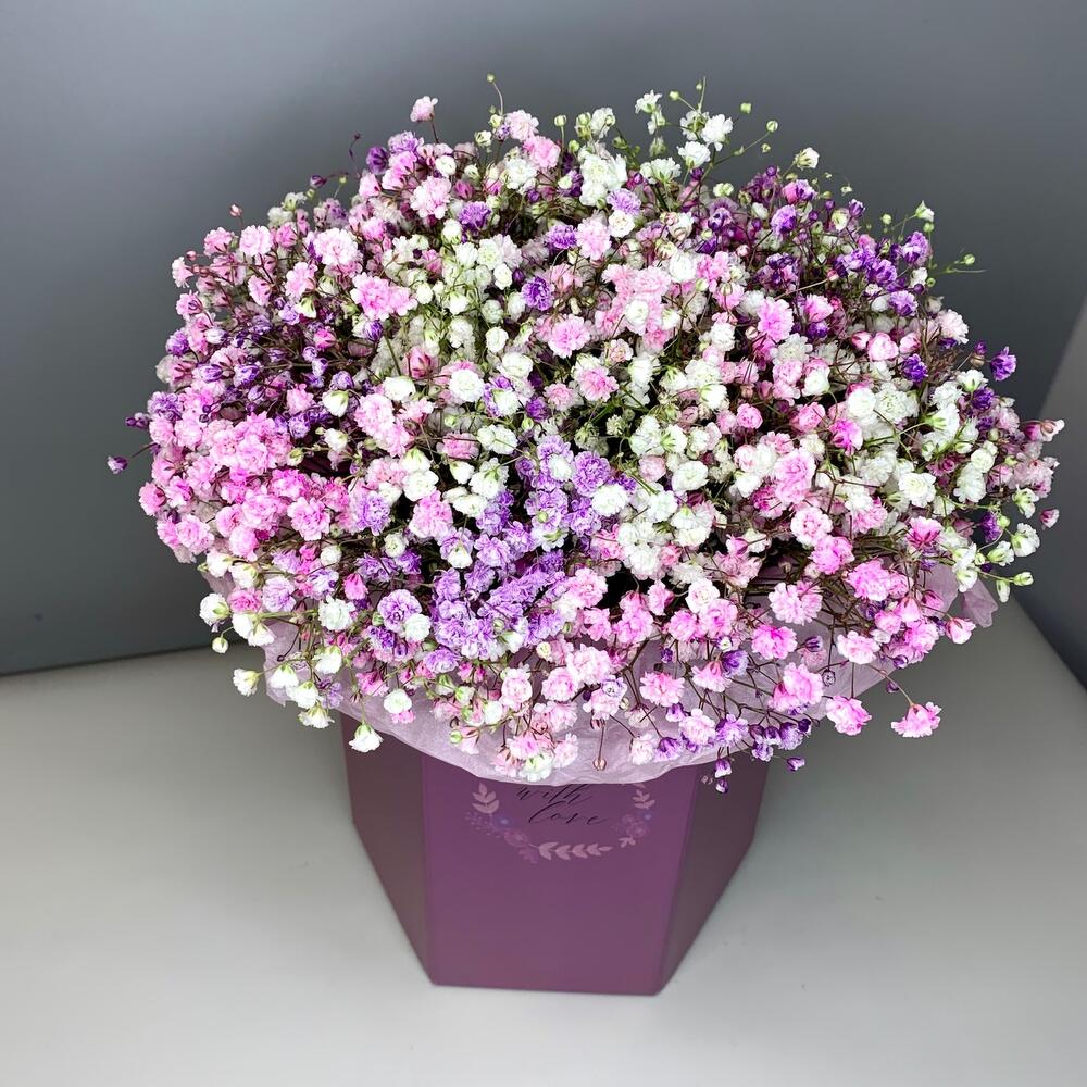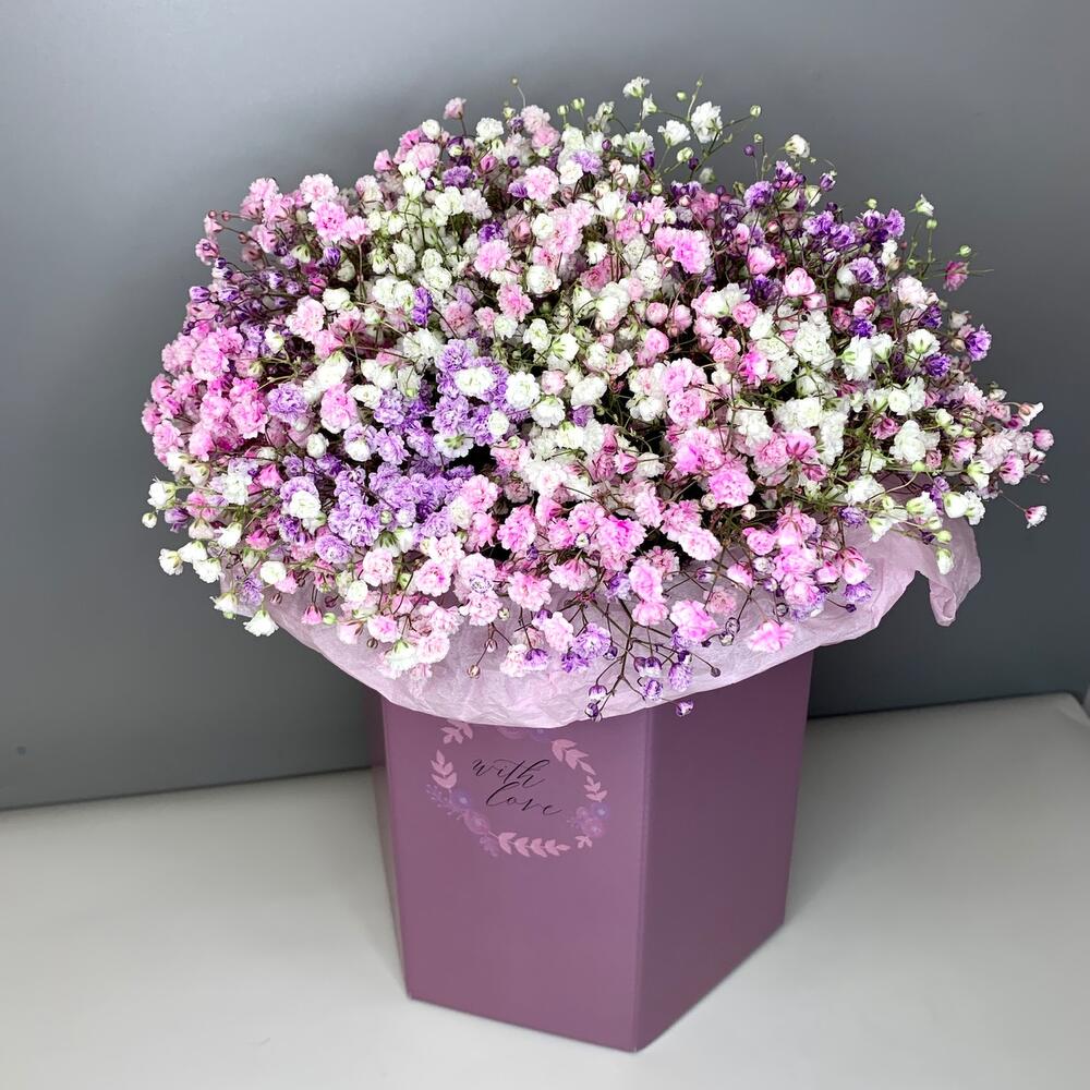 “Сиреневый туман” – композиция из гипсофилы в шляпной коробке