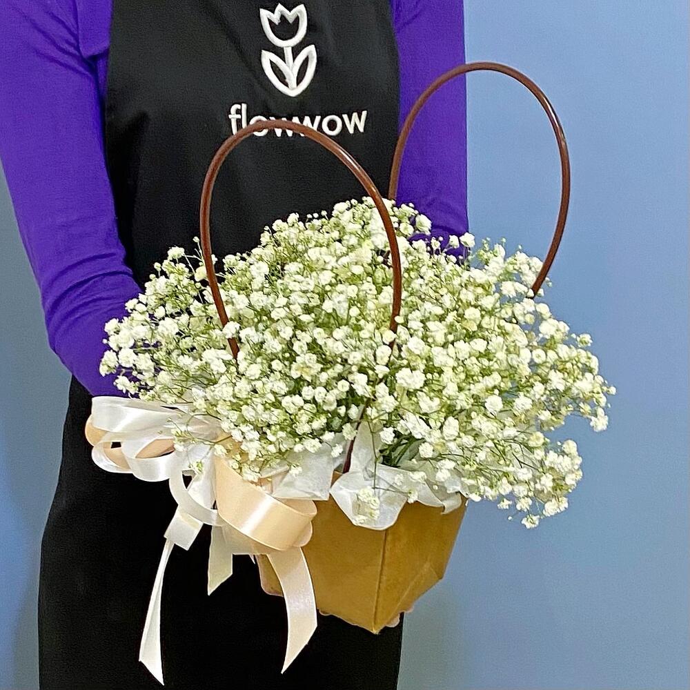 Комплимент с белой гипсофилой в сумочке