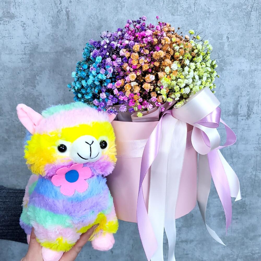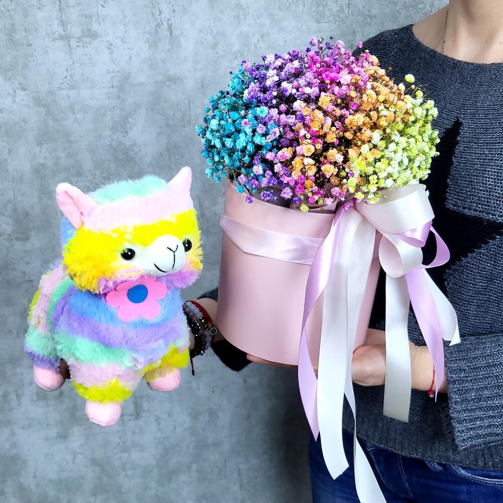 Гипсофила – 6 шт.Мягкая игрушка – 1 шт.Шляпная коробка – 1 шт.