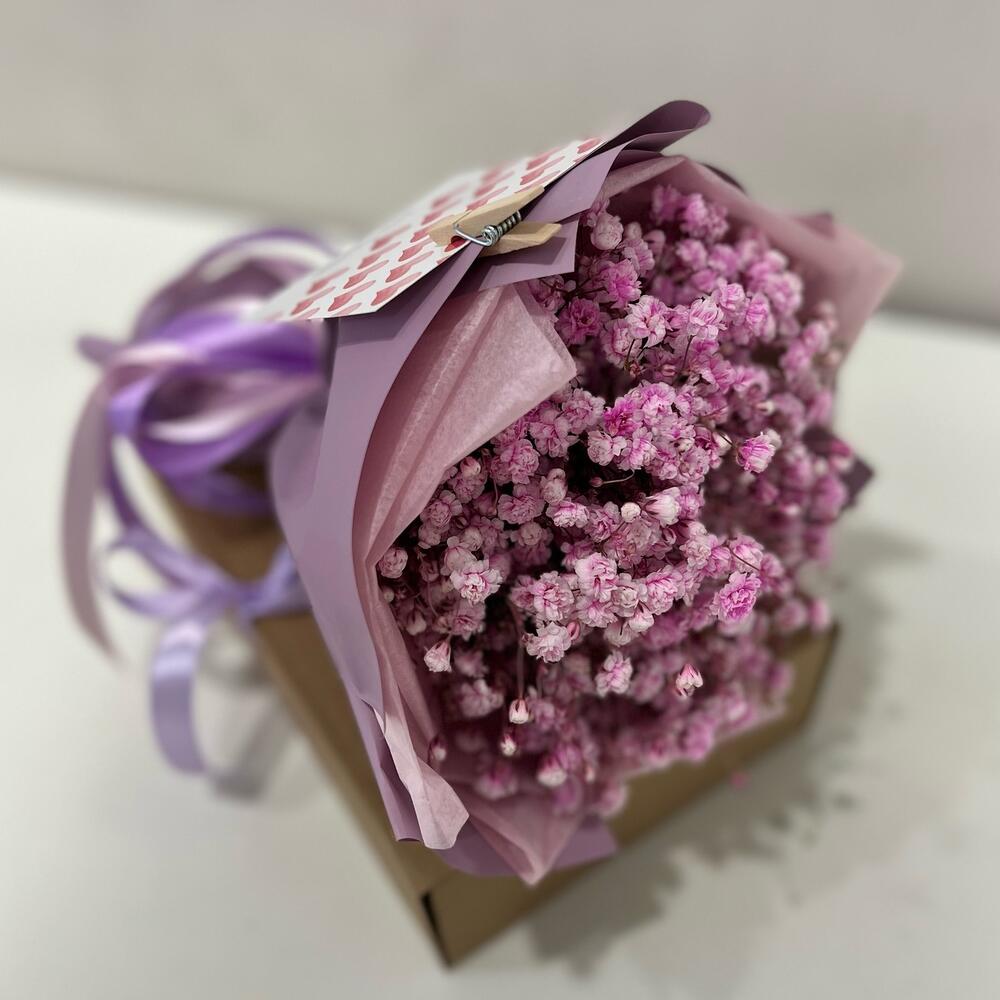 “Сиреневый туман” – композиция из гипсофилы в шляпной коробке