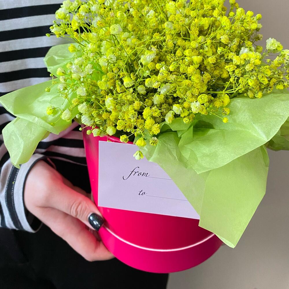 “Сиреневый туман” – композиция из гипсофилы в шляпной коробке