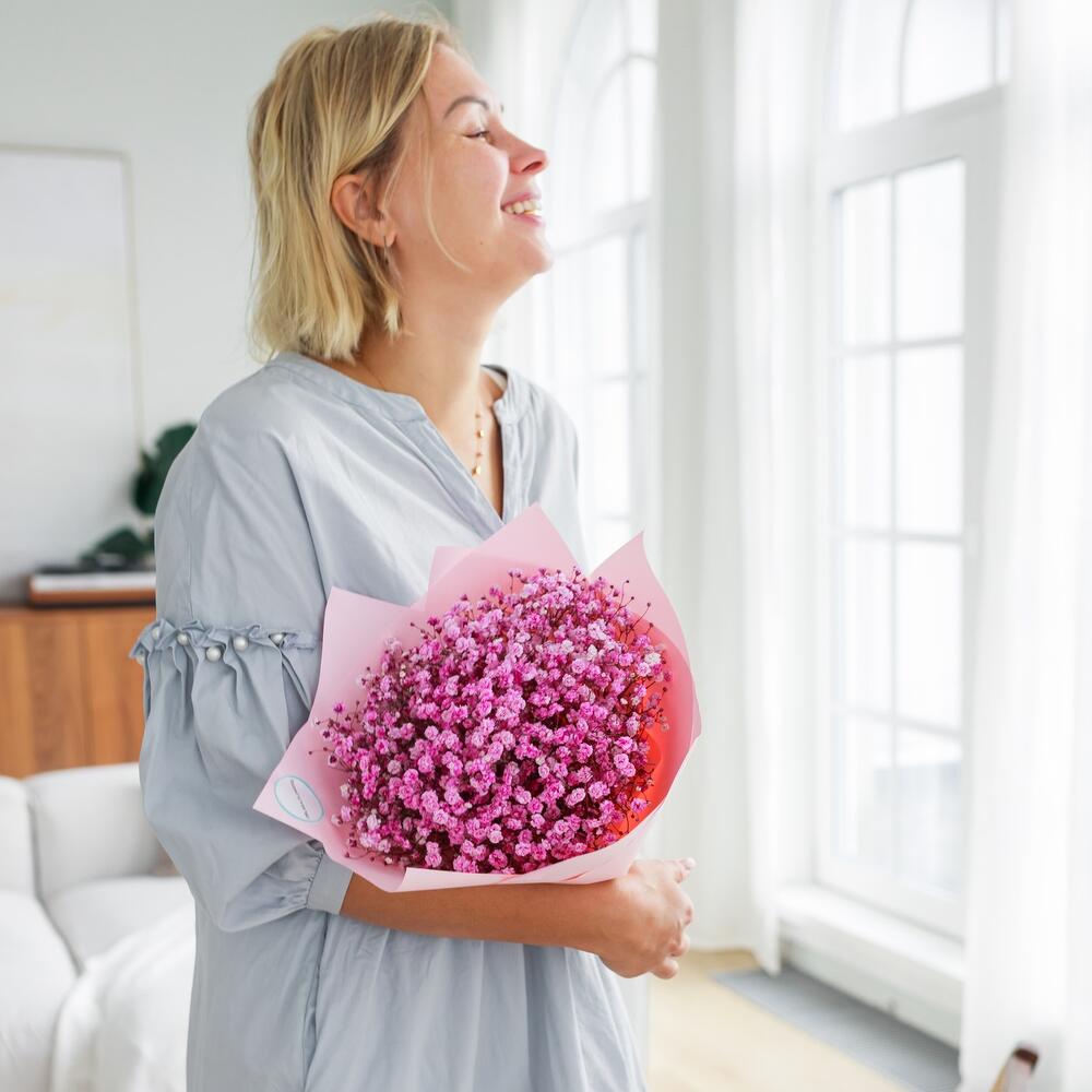 Очаровательный букет из воздушной гипсофилы. Ни одна дама, точно не останется равнодушной при виде такого букета .Инструкция по уходу за цветами прикреплена к каждому заказу.Цветы гипсофилы отличаются стойкостью и даже при высыхании не теряют, декоративности и цвета. Что позволяет, долгое время украшать интерьер в качестве сухоцветов.Подпишем открытку с вашими пожеланиями бесплатно