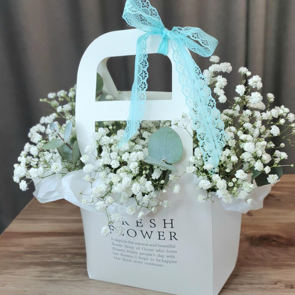 Лента Кружево – 1 шт.Эвкалипт пучок – 1 шт.Оазис флористический – 1 шт.сумочка декоративная – 1 шт.Гипсофила – 4 шт.