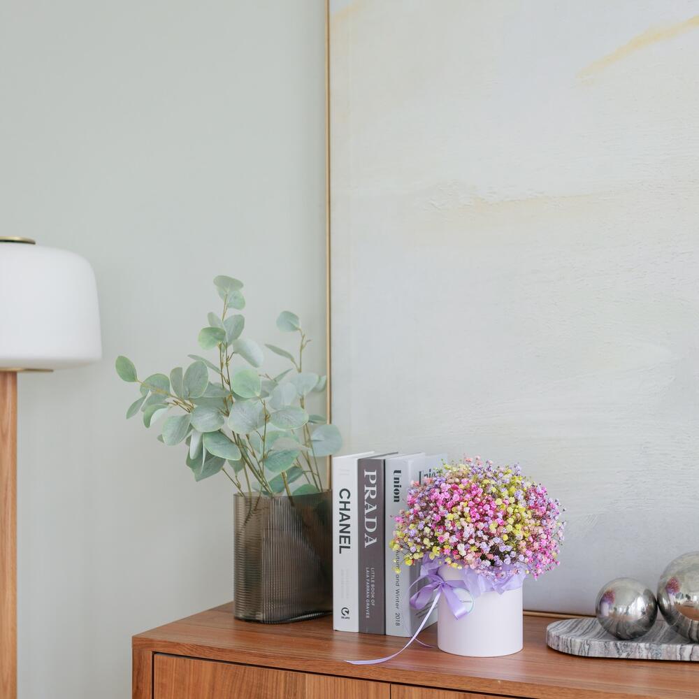 “Сиреневый туман” – композиция из гипсофилы в шляпной коробке
