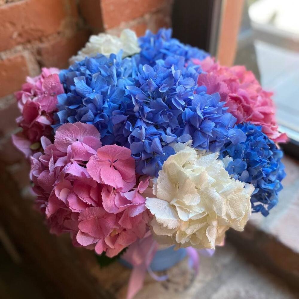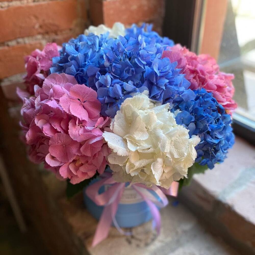 Букет из 9 гортензий в шляпной коробке