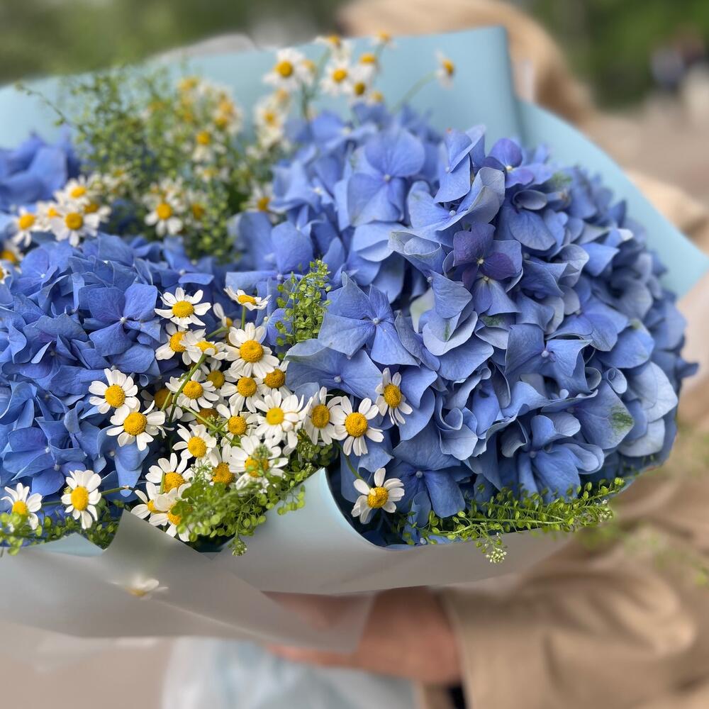 Гортензия – 3 шт.Лента атласная – 1 шт.Упаковка дизайнерская – 6 шт.Ромашка – 6 шт.Гринбелл – 4 шт.
