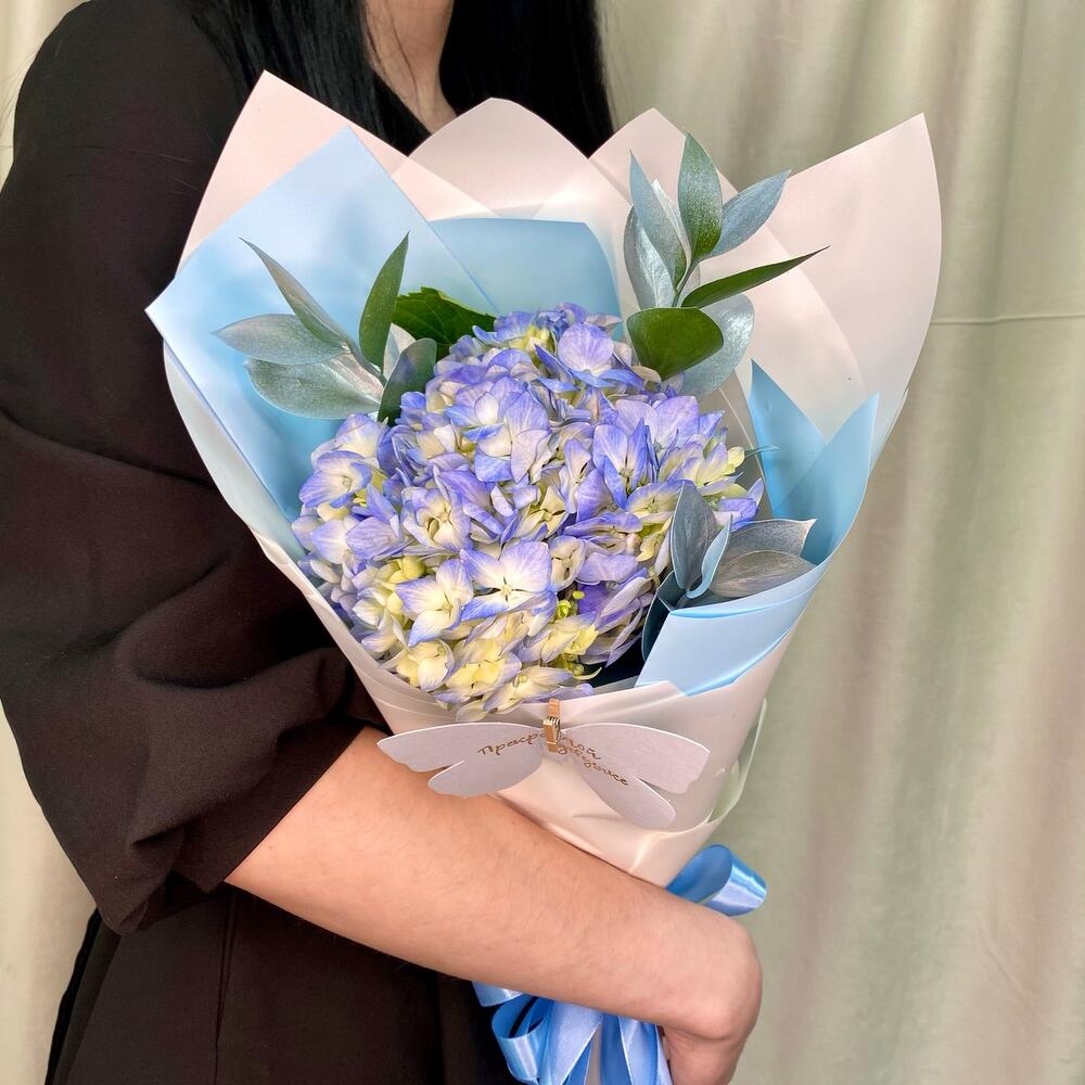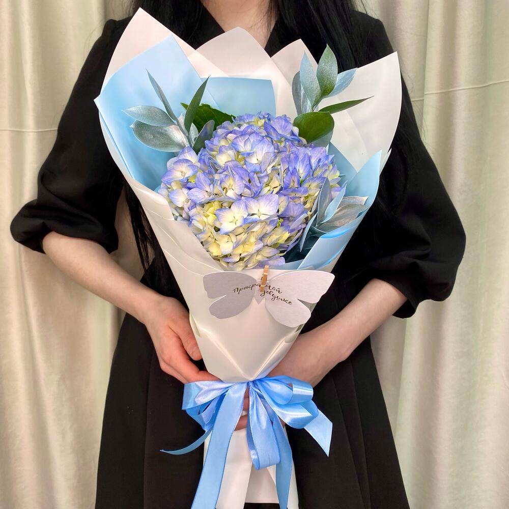 Лента атласная – 2 шт.Гортензия голубая – 1 шт.Рускус Израиль – 3 шт.Пленка матовая – 2 шт.Открыточка с вашими пожеланиями – 1 шт.
