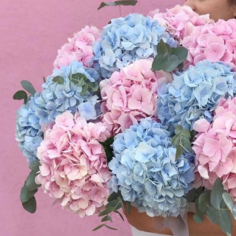 Гортензия розовая – 5 шт.Гортензия голубая – 4 шт.Коробка шляпная – 1 шт.Эвкалипт – 10 шт.Лента атласная – 2 шт.Открыточка с вашими пожеланиями – 1 шт.хорошее настроение – 100 шт.инструкция по уходу за цветами – 1 шт.Кризал – 1 шт.