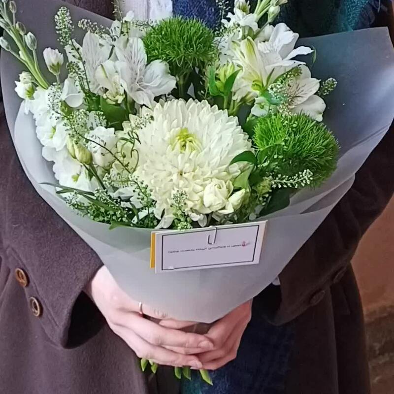 Маттиола – 2 шт.Диантус – 2 шт.Альстромерия белая – 2 шт.Лизиантус белый – 1 шт.Гринбелл – 1 шт.Рускус сочи – 4 шт.Хризантема белая одноголовая – 1 шт.Авторская упаковка – 1 шт.