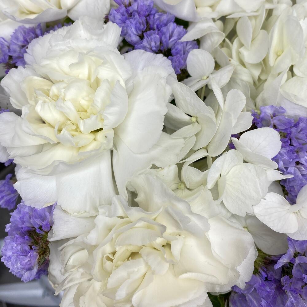Гортензия – 1 шт.Статица – 2 шт.Тишью – 1 шт.Коробка шляпная – 1 шт.Пистакия – 2 шт.Оазис флористический – 1 шт.диантусы – 6 шт.