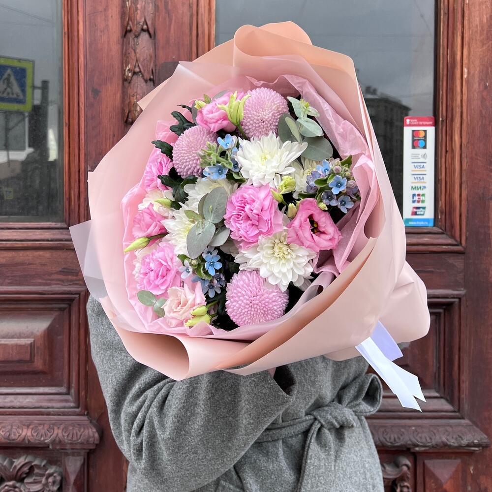 эустома розовая махровая – 1 шт.Оксипеталум – 3 шт.Хризантема момоко – 3 шт.Хризантема кустовая – 2 шт.Диантус – 3 шт.Эвкалипт – 1 шт.Тишью – 1 шт.Пленка матовая – 5 шт.Лента атласная – 2 шт.