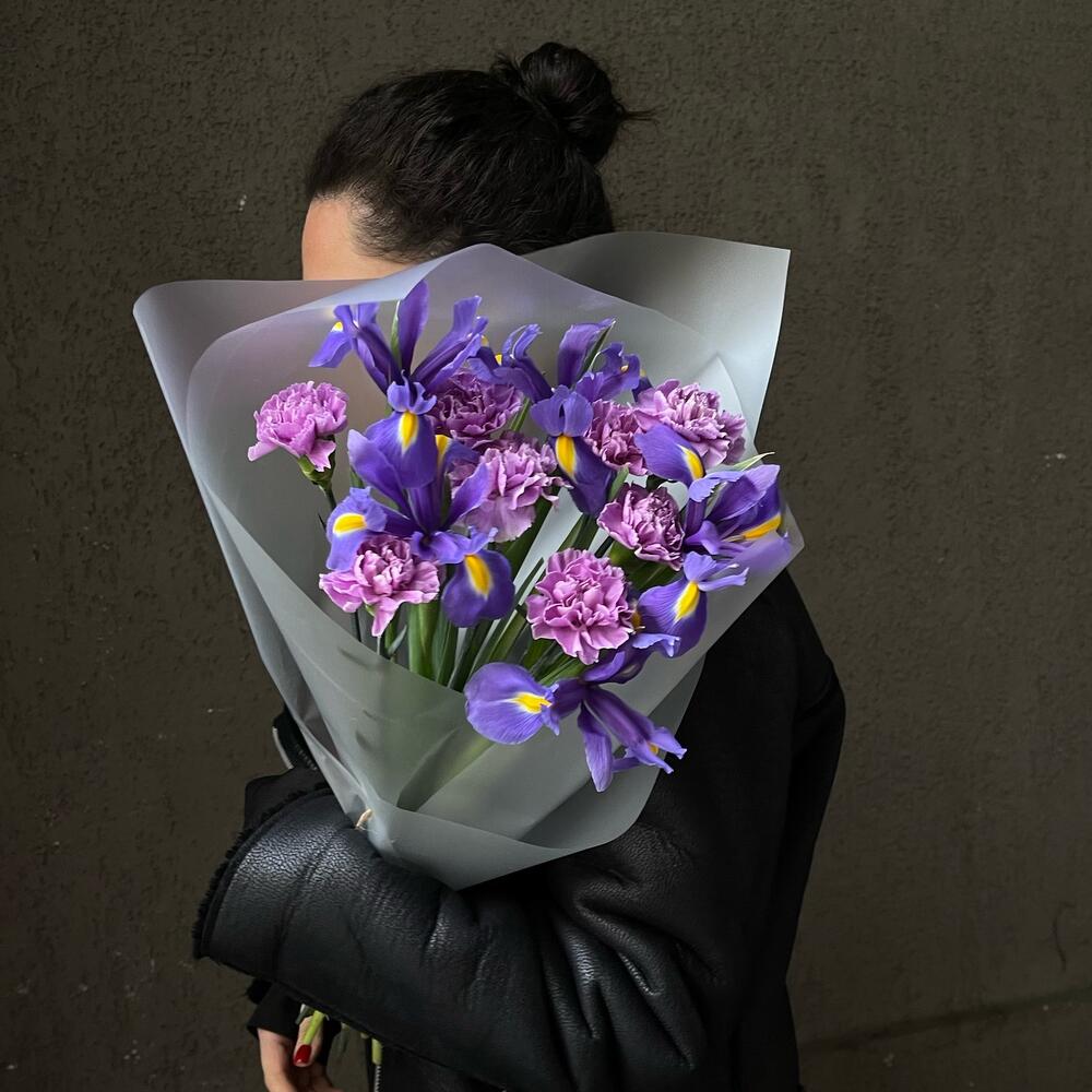 Гвоздика сортовая – 8 шт.Упаковка дизайнерская – 2 шт.Ирис Blue Magic – 5 шт.