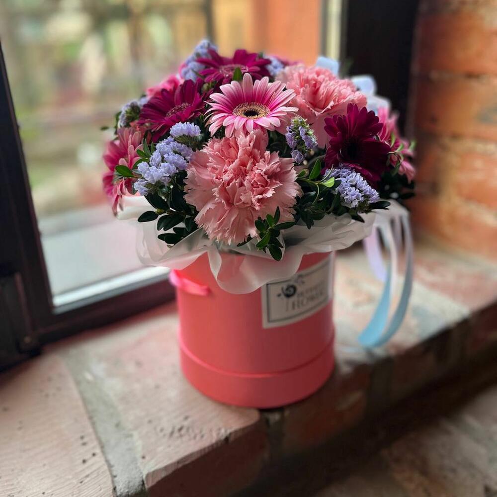 Букет из мини гербер, статицы и гвоздики в шляпной коробке “Сады Падишаха”