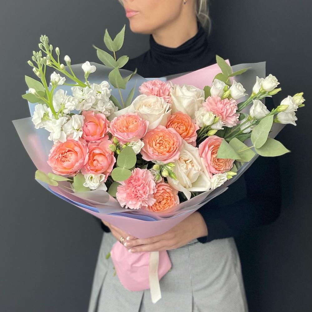 Лизиантус – 2 шт.Маттиола – 2 шт.Эвкалипт – 1 шт.Гвоздика – 3 шт.Фисташка – 3 шт.Упаковка дизайнерская – 3 шт