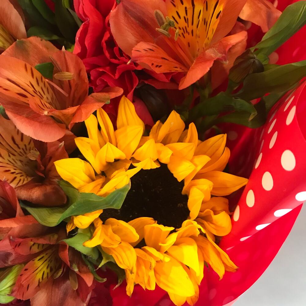 Альстромерия – 4 шт.Гвоздика – 5 шт.Подсолнух – 1 шт.бумага дизайнерская – 1 шт.