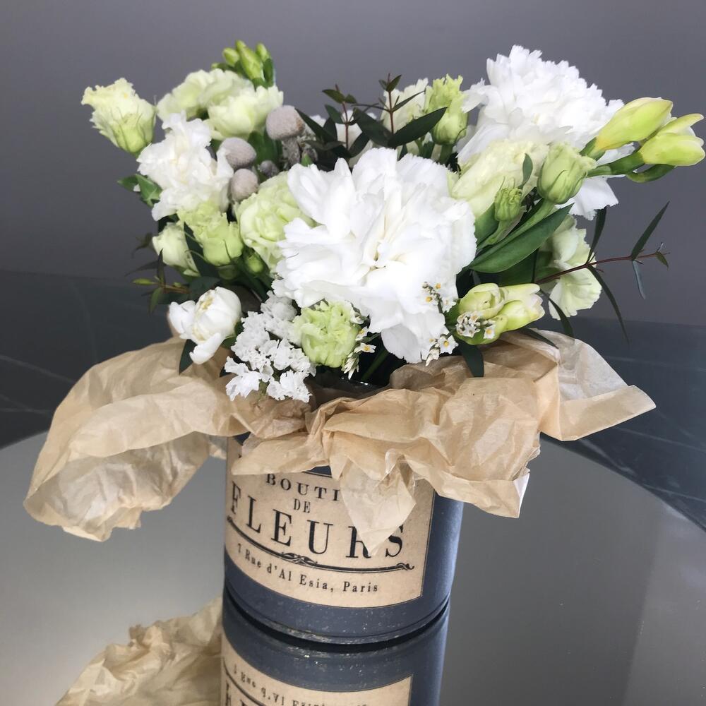 Лизиантус – 1 шт.Фрезия – 2 шт.Гвоздика – 2 шт.Гвоздика кустовая – 2 шт.Жестяное кашпо – 1 шт.комплимент от polyanka – 1 шт.