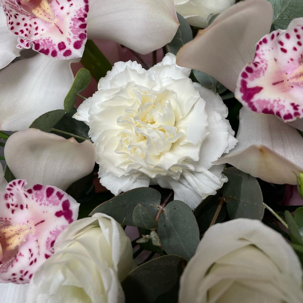Орхидея Цимбидиум – 3 шт.Эустома – 2 шт.Диантус – 3 шт.Эвкалипт – 5 шт.Оазис флористический – 1 шт.Коробка – 1 шт.