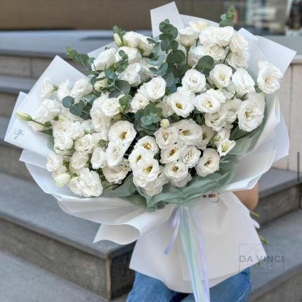 Белоснежный букет из маттиол, эустом и дельфиниума