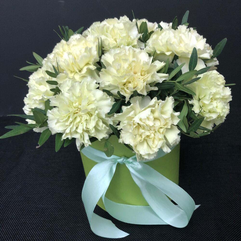Диантус – 15 шт.Коробка шляпная – 1 шт.Оазис флористический – 1 шт.Фисташка – 2 шт.