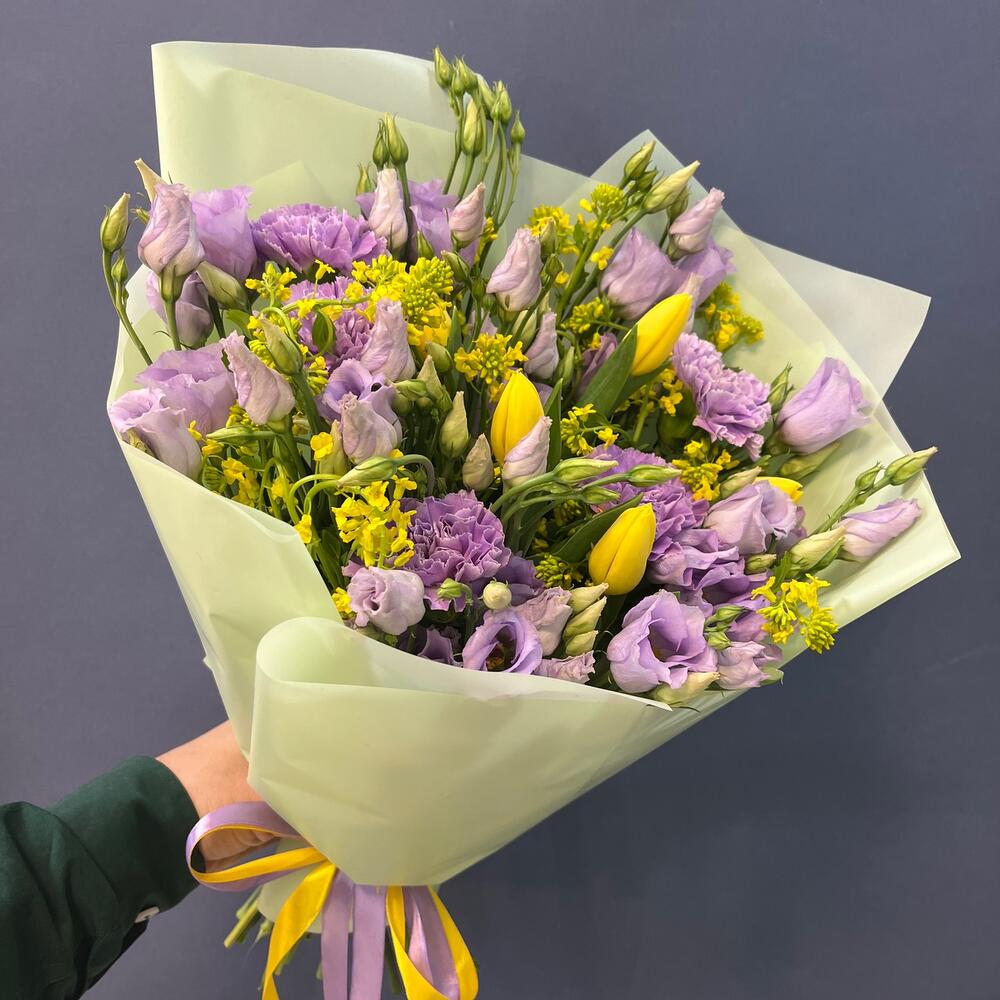 Тюльпан желтый – 5 шт.Лизиантус лавандовый – 5 шт.Диантус лунный – 5 шт.Лента атласная желтая – 1 шт.Лента атласная фиолетовая – 1 шт.упаковка корейская пленка мятная – 1 шт.экзотика зелень желтая – 10 шт.