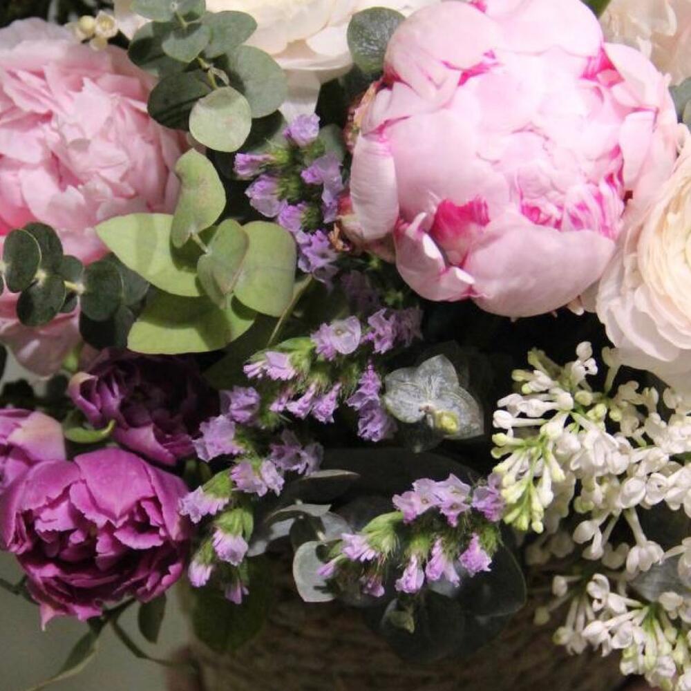 Пион – 5 шт.Сирень – 1 шт.Ранункулюс – 7 шт.Тюльпан – 1 шт.Ландыш – 5 шт.Статица – 2 шт.Скабиоза – 3 шт.Диантус – 5 шт.Эвкалипт – 10 шт.Лукошко плетеное – 1 шт.Оазис флористический – 1 шт.