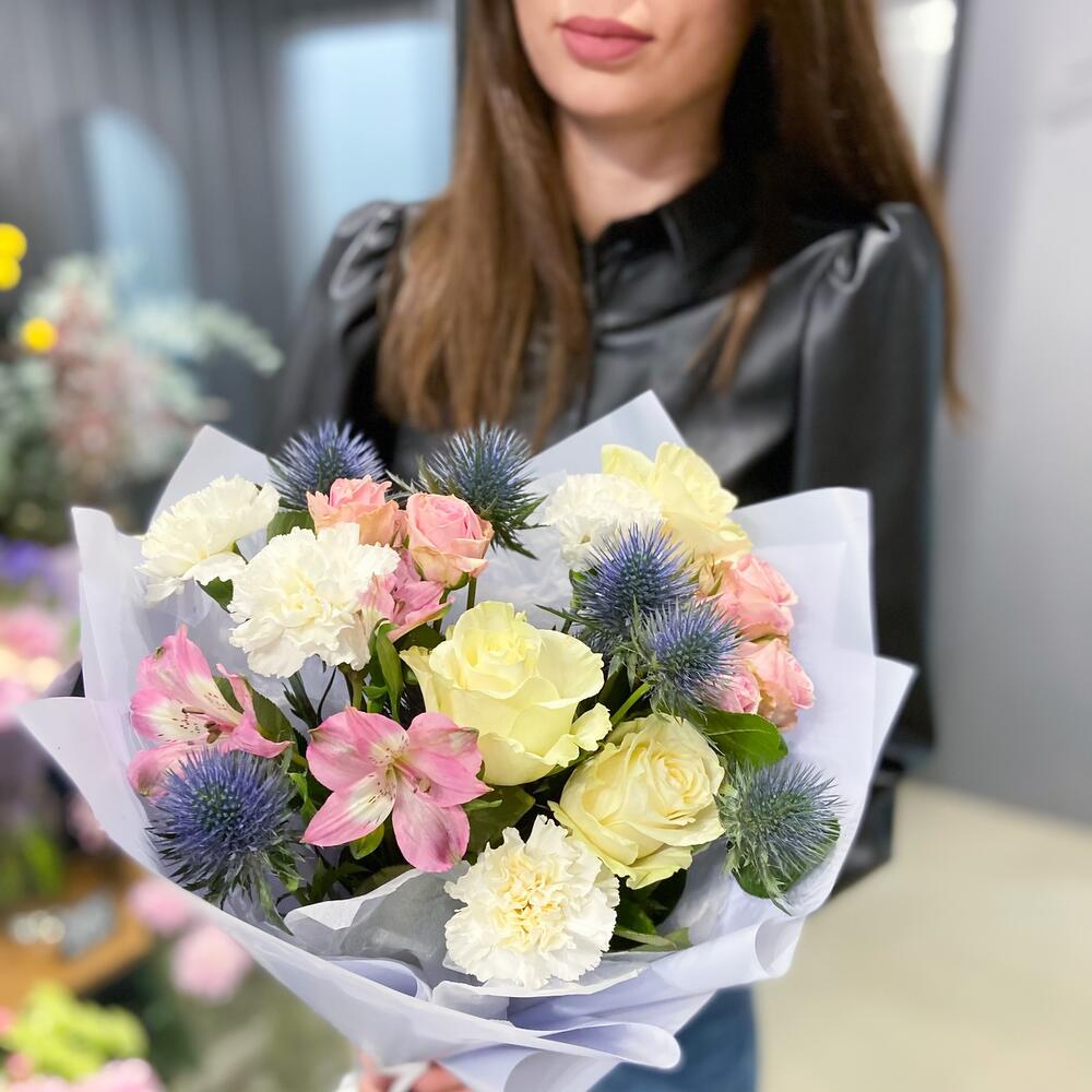 Альстромерия – 1 шт.Роза кустовая – 2 шт.Упаковка – 1 шт.Гвоздика – 4 шт.Эрингиум синий – 2 шт.Роза белая мондиаль – 3 шт.